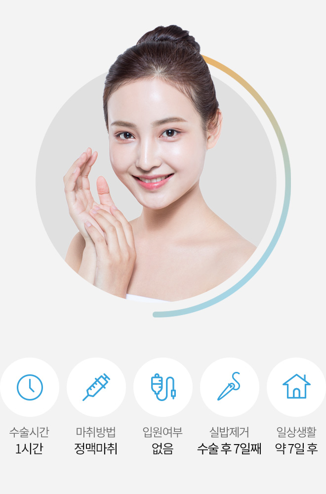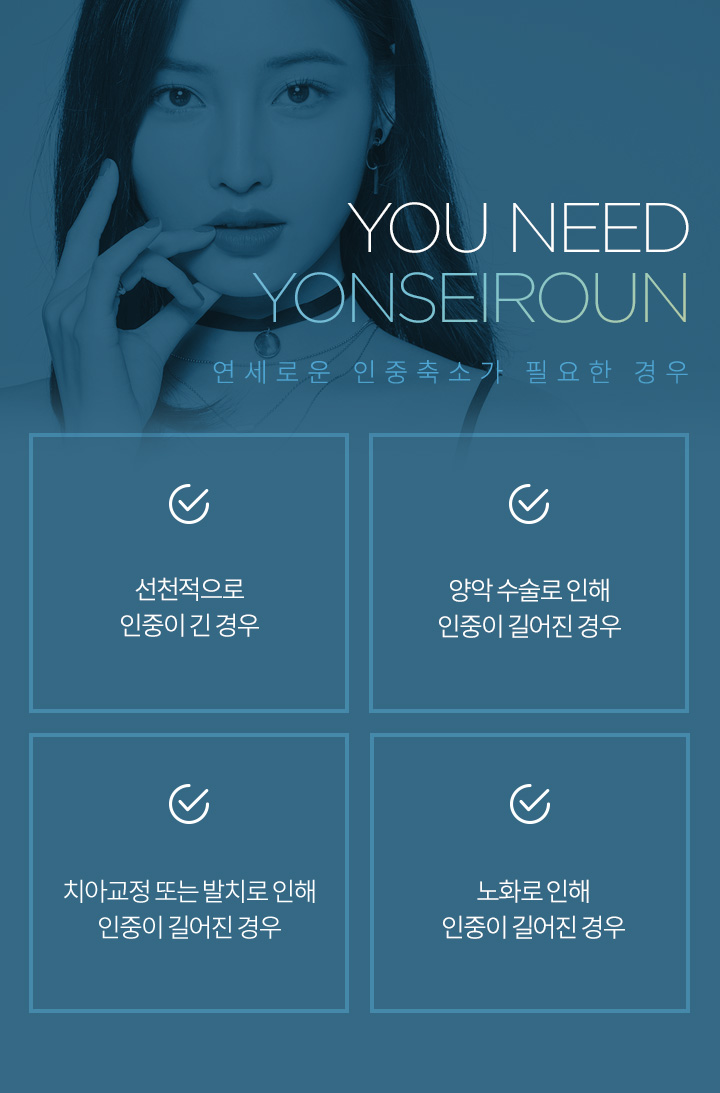 고전적인 인중축소 수술 방법에서 벗어나 흉터에 대한 만족도를 개선하고 근육층까지 절제하는 것이 아닌, 피부 속 깊은 스마스(SMAS)층까지만 당겨 자연스러움을 살린 연세로운성형외과의 인중축소 수술 방법입니다.